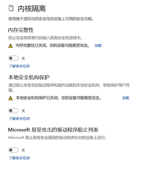 - 关闭内核隔离: 设置 -> 隐私和安全 -> Windows 安全中心 -> 设备安全性 -> 内核隔离 -> 内存完整性 (关)。