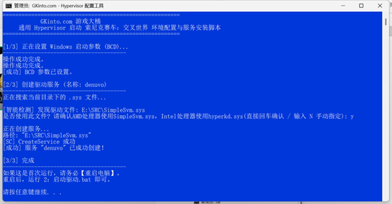 - 作用: 该脚本会自动执行 bcdedit 命令,开启测试模式(TestSigning)并关闭系统自带的 Hypervisor 启动项,不关闭会造成冲突导致错误,通常错误代码为Error 3224698910。